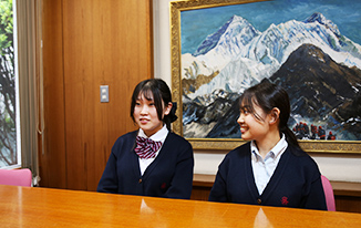 女子だけだから思い切って自分を出せる 先生も先輩も面倒見のいい、明るくおおらかな校風です総合コース3年 石橋麻里亜クララさん、特別進学コース3年 小松愛茉さん