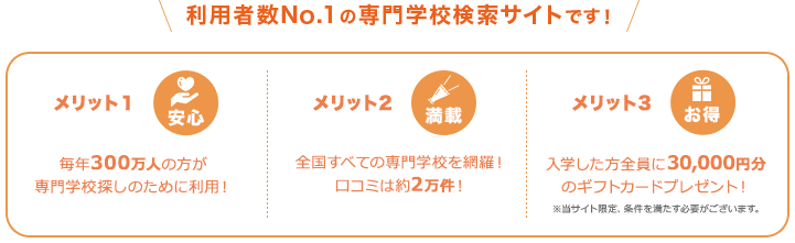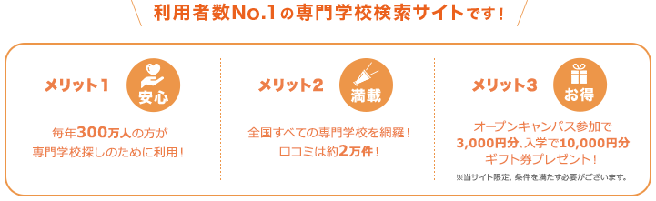 みんなの専門学校情報は、専門学校を探している方のための専門学校検索サイトで、年間利用者数400万人を突破しています。 みんなの専門学校情報では各専門学校を口コミで比較することができ、資料請求やオープンキャンパス予約が出来ます。