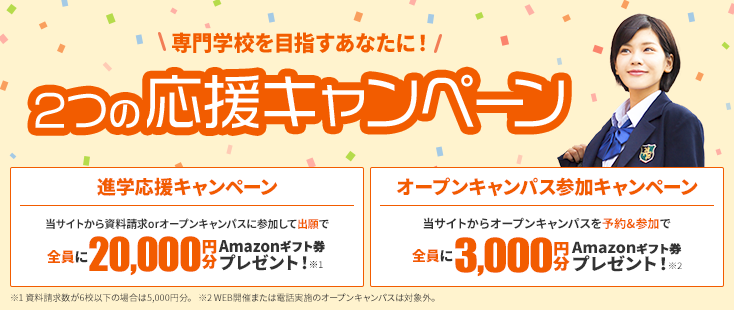 - 進学応援キャンペーンは「みんなの専門学校情報」独自のキャンペーンとなっており、各専門学校のキャンペーンではございません。