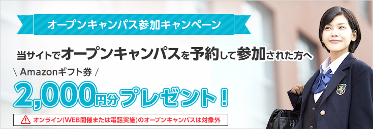 1月1日~31日または4月1日~5月31日または10月1日~11月21日または2021年以前の11月22日~12月31日にオープンキャンパスの予約をした場合、2,000円のAmazonギフト券プレゼント。